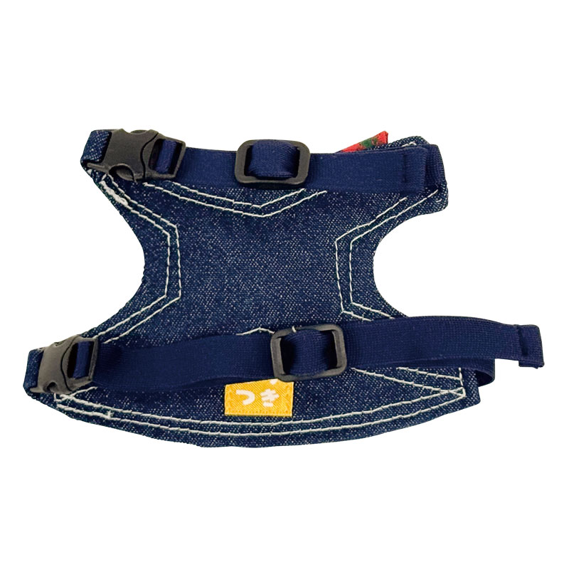しっぽオリジナルのハーネス。体に負担をかけない様に背中の部分にクロス型の芯を縫い付けてあります。体を強く締め付けない少し伸縮するベルトで、居場所が分かるように鈴がついています。
