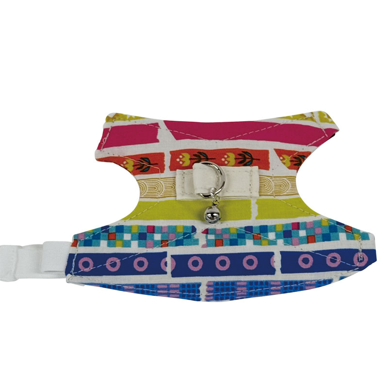 しっぽオリジナルのハーネス。体に負担をかけない様に背中の部分にクロス型の芯を縫い付けてあります。体を強く締め付けない少し伸縮するベルトで、居場所が分かるように鈴がついています。