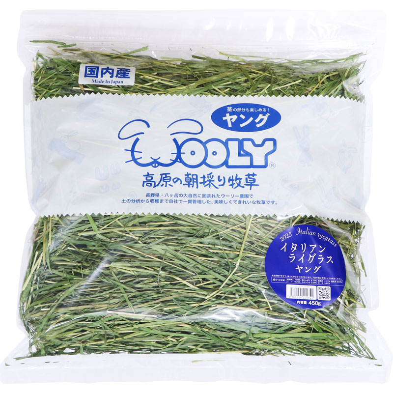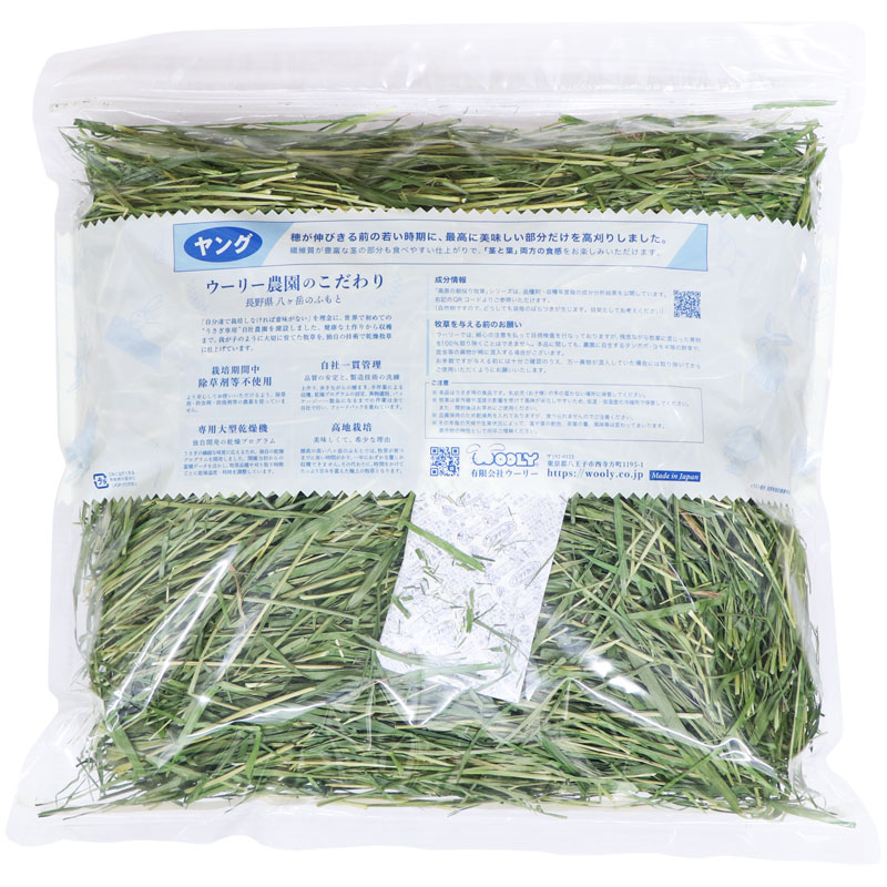 八ヶ岳の大自然に囲まれたWOOLY農園で土づくりから収穫までを一貫管理して大切に育てられたイタリアンライグラスの若刈りヤングです。収穫してすぐに温風乾燥しました。香り高く、茎にはほのかに甘みがありうさぎさんにはよりおいしく感じられると思います。うさぎさんにも四季折々のおいしさを味わってほしい、そんな思いが込められています。季節限定の味をお楽しみくださいね。期間限定販売です。植物なので、育成気候により色、味、堅さが若干変わることがあります。